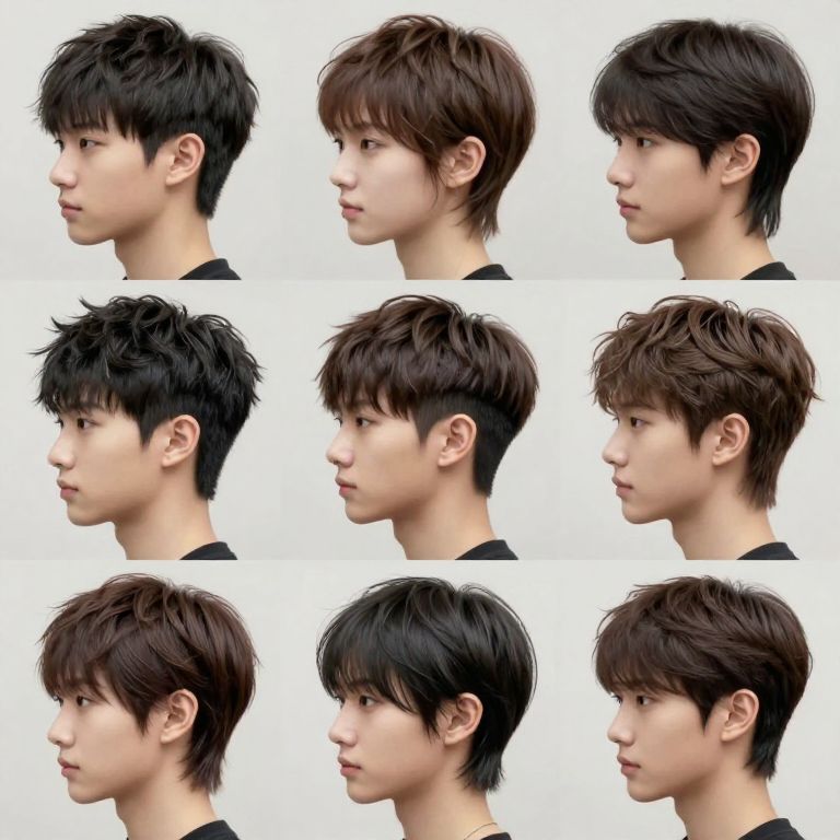 Photograph of a young Asian man with short, dark brown hair in twelve side profiles, showing various hair textures and styles against a white background.