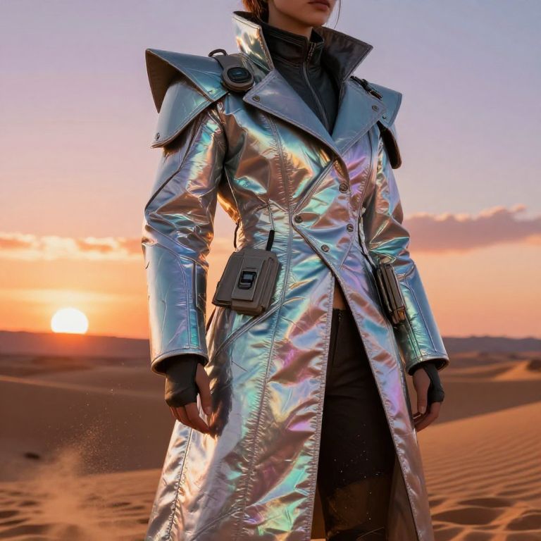 Photograph of a person standing in a desert at sunset. They wear a long, silver, metallic, iridescent trench coat with large, angular shoulders and two black pouches on the front. The coat reflects the pink, orange, and purple hues of the sunset. The person's face is partially obscured by the coat's collar. They also wear black gloves. The desert sand dunes are visible in the background, with the sun low on the horizon. The image has a futuristic, sci-fi style.
