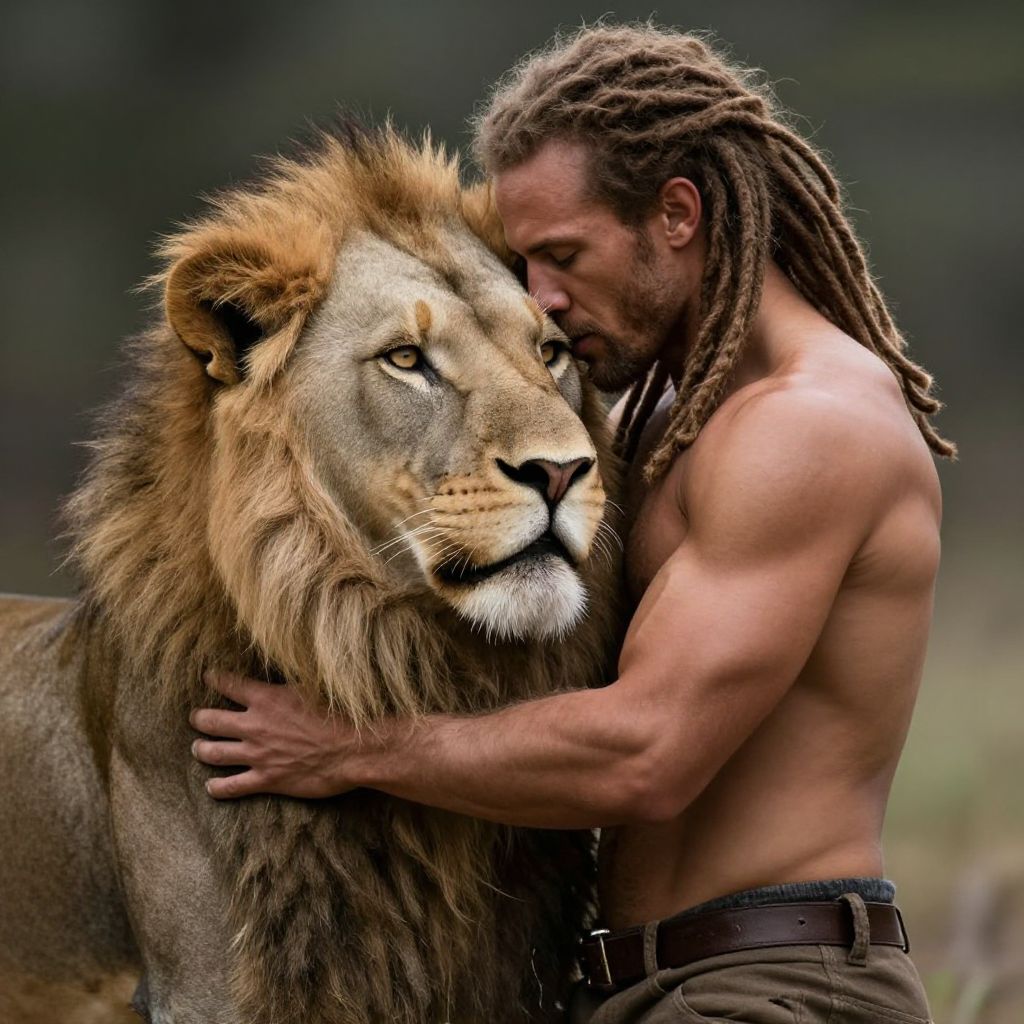 Photograph of a muscular, shirtless man with dreadlocks hugging a large, majestic lion with a thick mane, outdoors in a blurred natural background