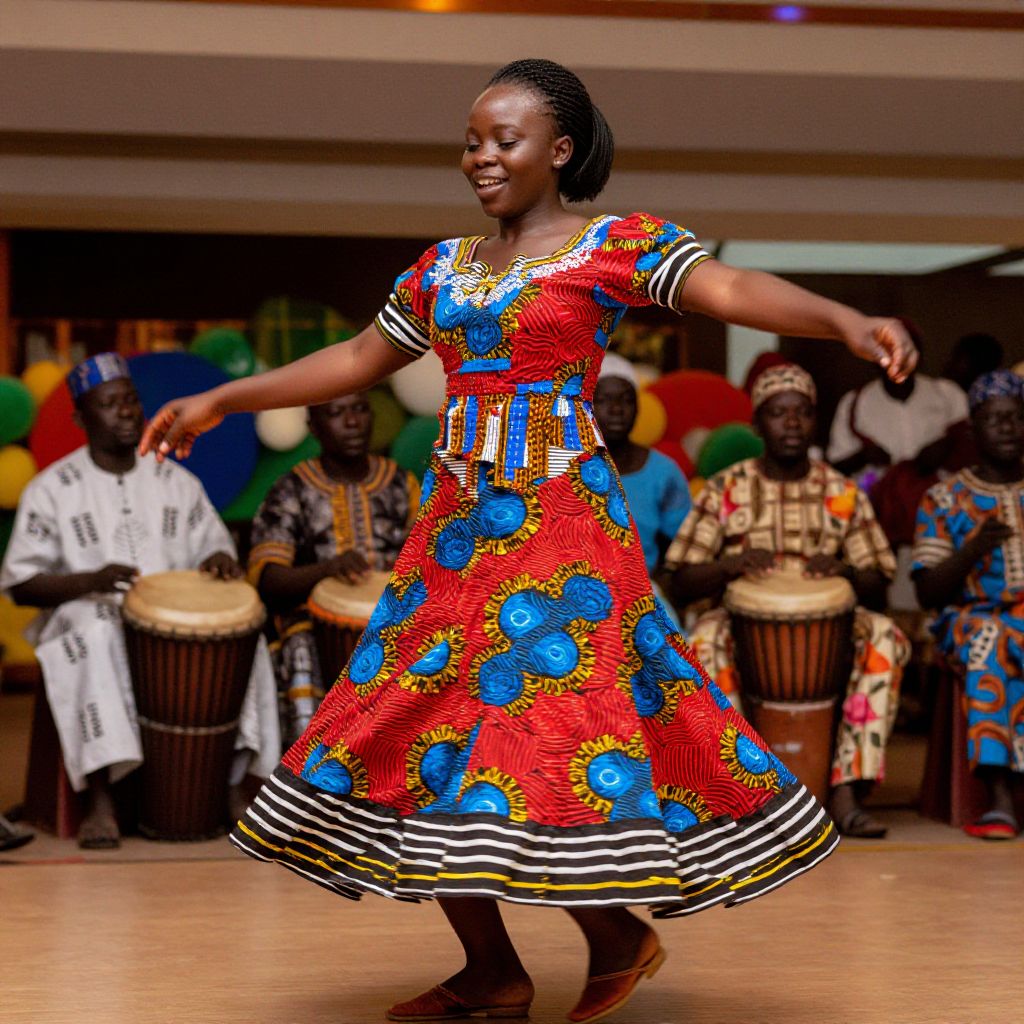 Photograph of a smiling African woman dancing on stage, wearing a vibrant, traditional African dress with red, blue, and gold patterns. She has braided hair and is mid-spin, her arms outstretched. In the background, there are seated onlookers, including musicians with drums, and a blurred, warmly-lit interior setting. The audience and musicians are dressed in colorful, traditional attire.