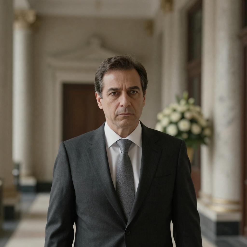 Two men shaking hands in a grand hall with columns and red carpet. The older man wears a black clerical robe with a pink sash and a large gold cross, symbolizing a high-ranking religious figure. The younger man has dark hair and is dressed in a brown suit jacket and light blue shirt. The background shows several people dressed in formal black attire standing near a staircase, emphasizing a formal and respectful occasion.