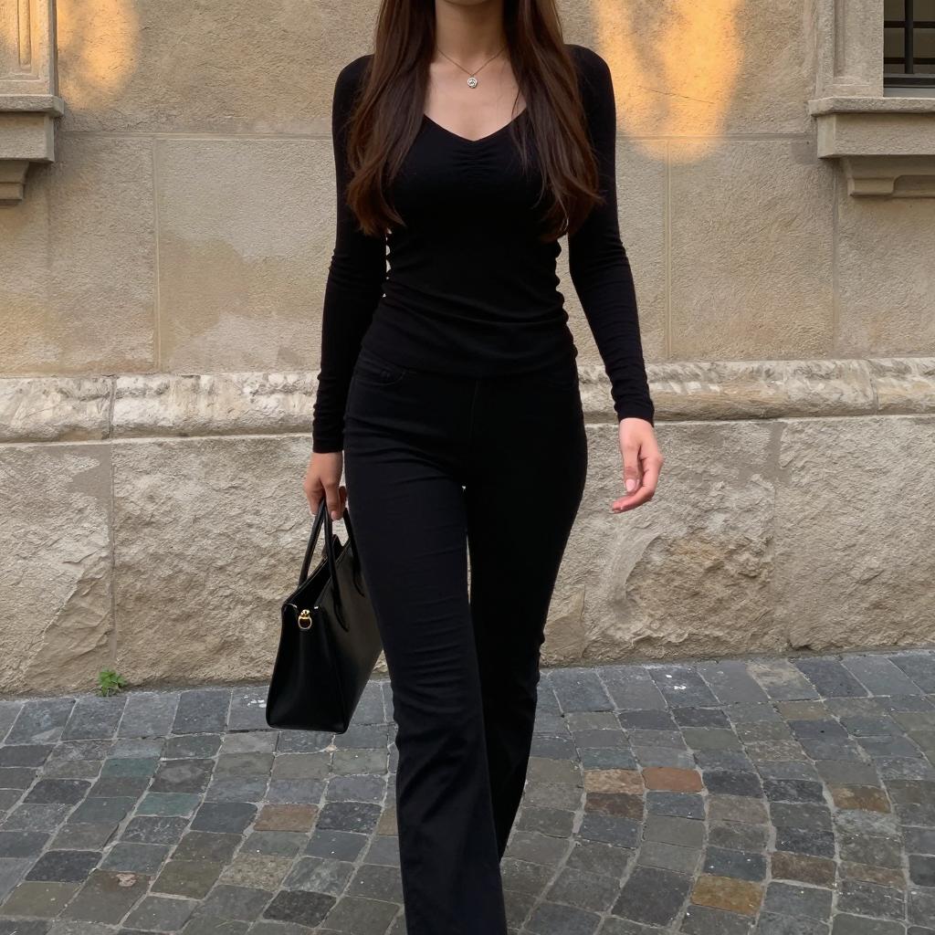Woman with long brown hair, wearing a black long-sleeve V-neck top and black pants, holding a black purse. She walks in front of a stone wall with yellow lighting. The ground is paved with cobblestones. Her face is not visible.