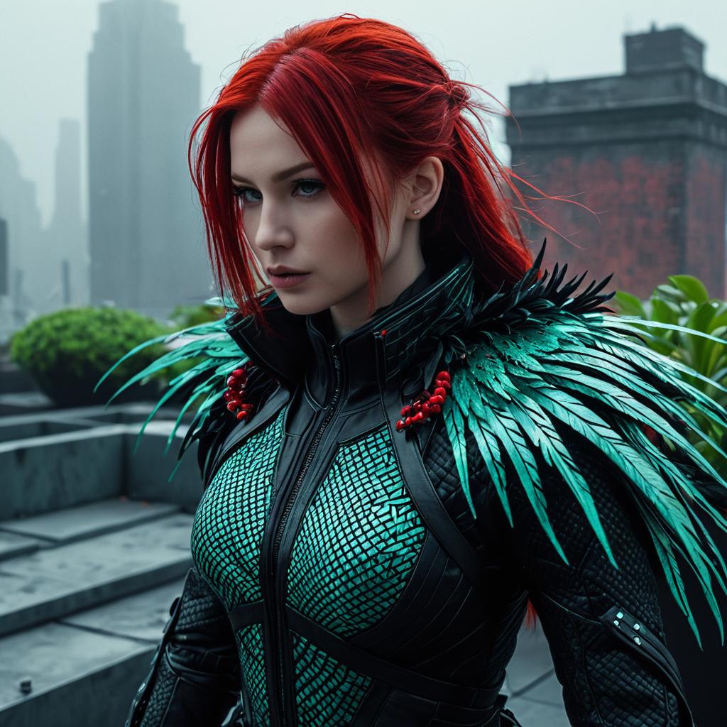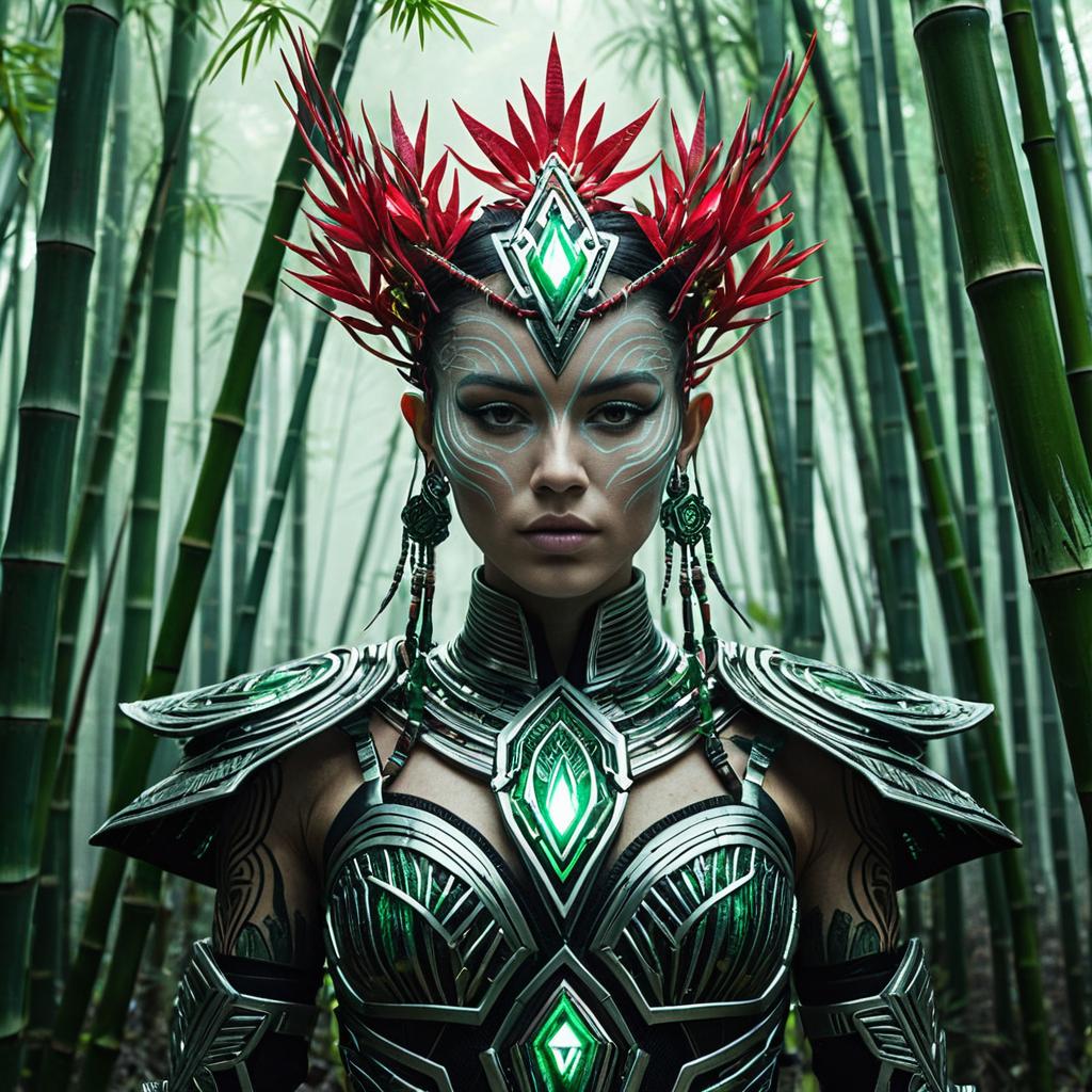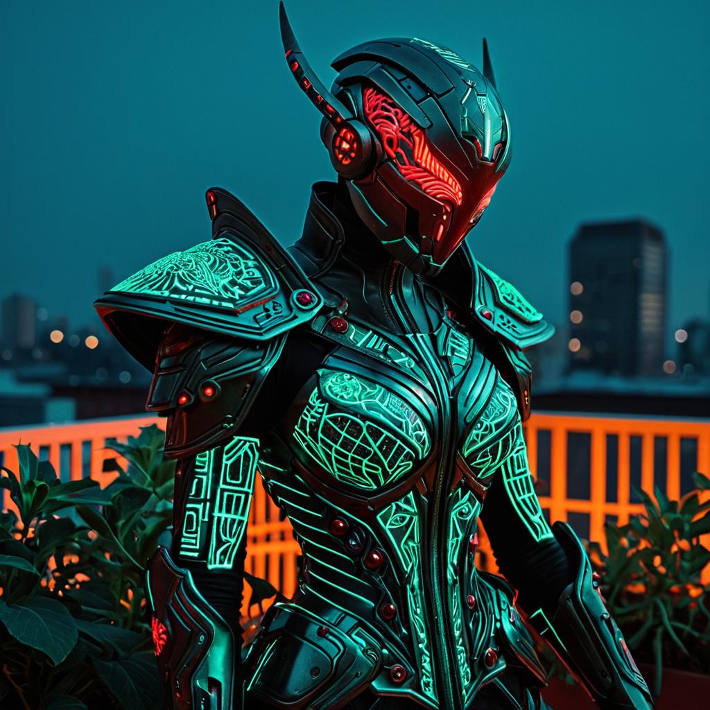 In a foggy rooftop helipad at dawn, medium shot portrait of a dark-skinned augmented street samurai man, hyper-detailed 3D Octane render with bright three-point cinematic lighting, adorned in interwoven carbon fiber plates with glowing blue glyphs and a holographic keras helmet, raspberry chili red coral accents, sinuous root embroidery, iris van Herpen cyberpunk haute couture, ultra-sharp focus, photorealistic detail.