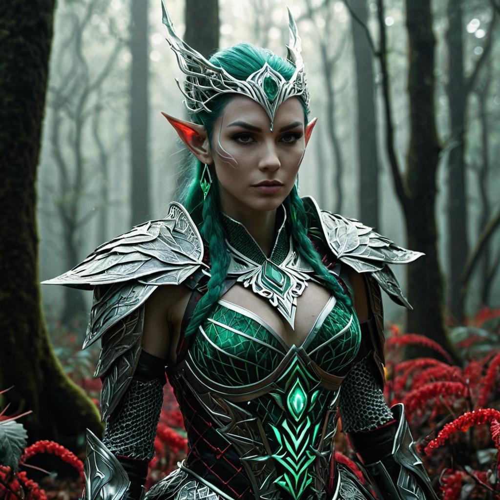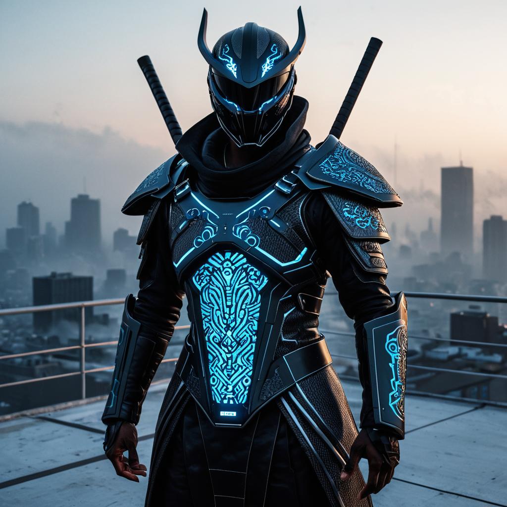 Hyper-detailed 3D rendered portrait of a dark-skinned augmented street samurai man standing on a foggy rooftop helipad at dawn. He is wearing a futuristic armored suit made of interwoven carbon fiber plates with glowing blue glyphs, a holographic Keras helmet with illuminated patterns, and dual katanas on his back. The armor features raspberry chili red coral accents and sinuous root embroidery, inspired by Iris van Herpen's cyberpunk haute couture design. The image showcases a photorealistic style with bright cinematic lighting and an urban skyline blurred in the background.