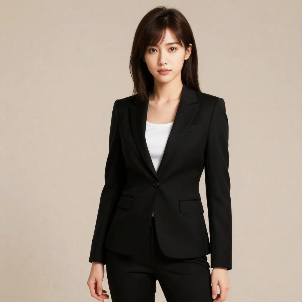 (realistic:1.5), (masterpiece, Extremely detailed CG unity 8k wallpaper, best quality, highres:1.2), (ultra_detailed, UHD:1.2), (pixiv:1.3), distinct, detailed face, a girl, black trousers, solid background, suit
