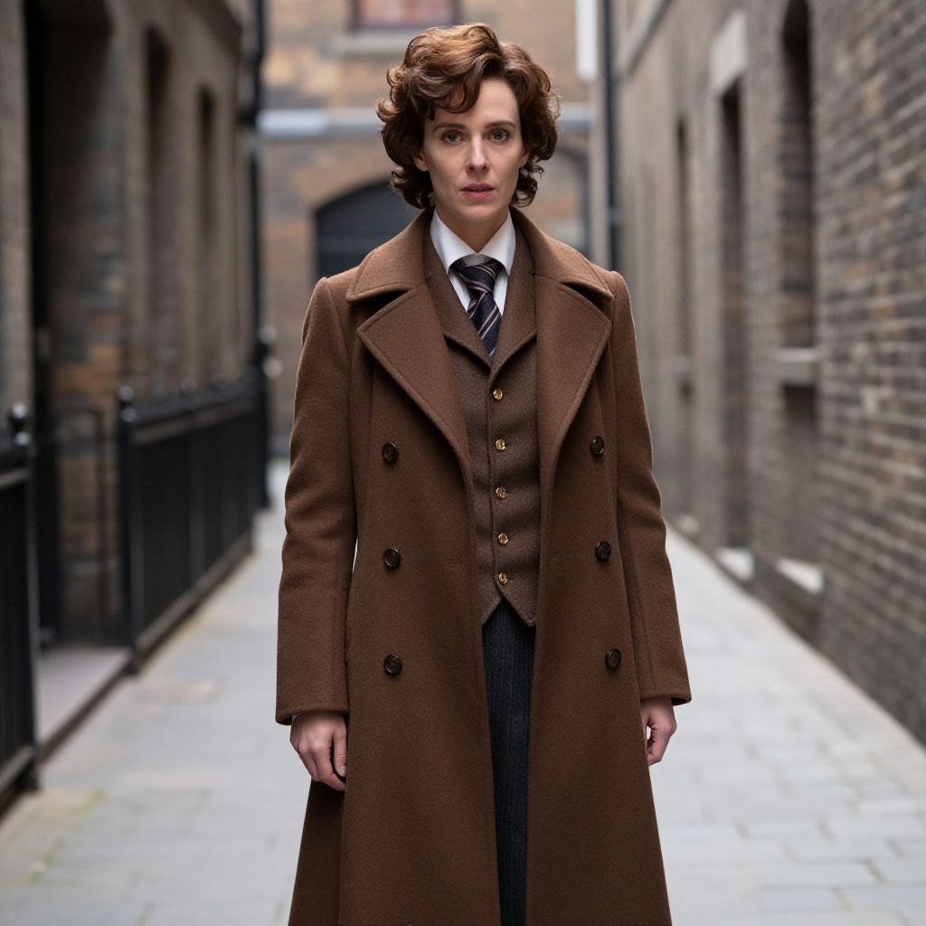 Sherlock Holmes Woman Costume, woman in a brown coat and tie standing in a narrow alleyway