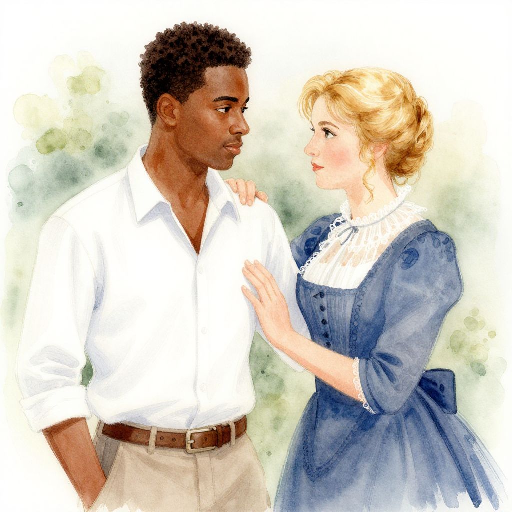 Digital illustration of a dark-skinned man in a white shirt and beige pants, gazing at a blonde woman in a blue Victorian dress, standing close