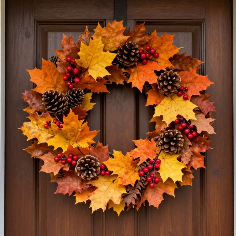 Vibrant autumnal wreath adorns a rustic front door, featuring a circular arrangement of orange, yellow, and brown leaves interspersed with dark pinecones and clusters of red berries, creating a warm and festive seasonal display.