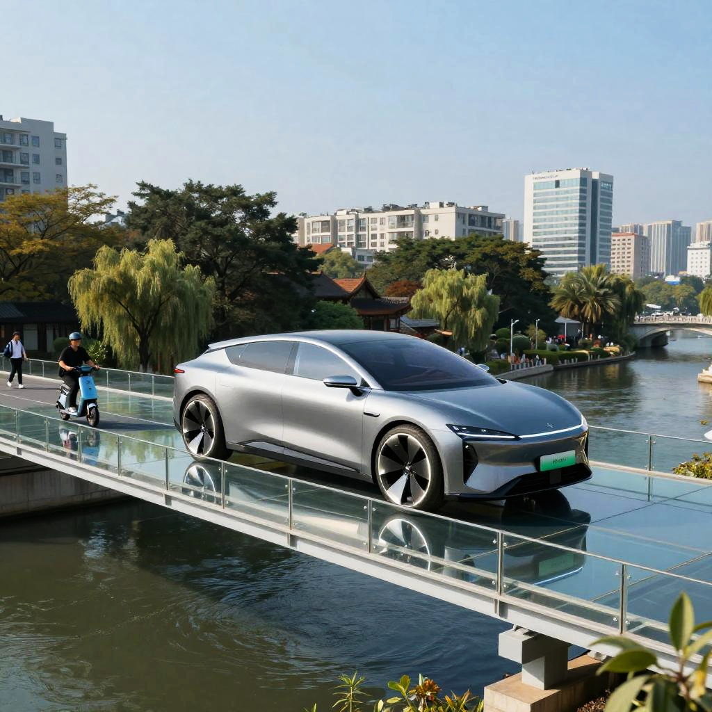 Stable EV concept futuristic vehicle crossing a glass bridge above a river in a smart eco-city, bright daylight with clear skies, elegant electric car design with smooth lines and glowing wheels, nearby pedestrians using e-scooters and digital devices, nature seamlessly integrated with technology.