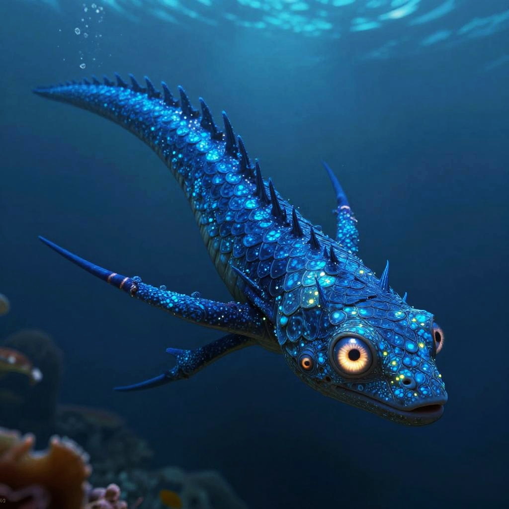 Six eyed creature with long blue body, surreal fantasy art, detailed scales, bioluminescent patterns, glowing eyes, deep ocean background, mystical atmosphere, highly detailed, 8k resolution