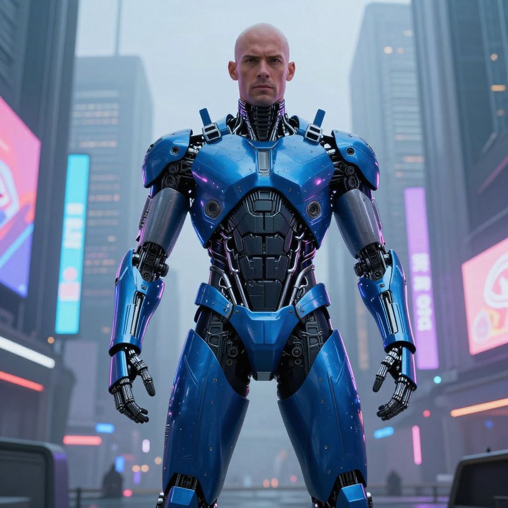 Photorealistic CGI of a young, short-haired woman in a sleek, metallic cyber suit, standing in a futuristic, neon-lit city street.