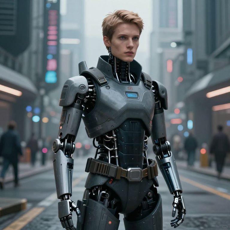 A CGI-rendered image of a young woman with short, light brown hair, standing in a futuristic, neon-lit city street at night. She wears a sleek, black and silver robotic exoskeleton suit with glowing blue accents, high-tech armor plating, and a utility belt. The background shows blurred city lights and pedestrians, with tall buildings and streetlights on either side. Her expression is focused, and the overall scene has a cyberpunk aesthetic with a moody, urban atmosphere. The texture of her suit is metallic and smooth, contrasting with the gritty, concrete street.