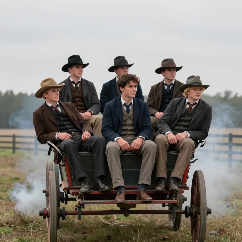 Photograph of five male miners in dark, dirty overalls and caps with headlamps, standing in front of wooden mine carts. One miner on the left stands apart, others lean on carts, looking inward. Dim, industrial setting.