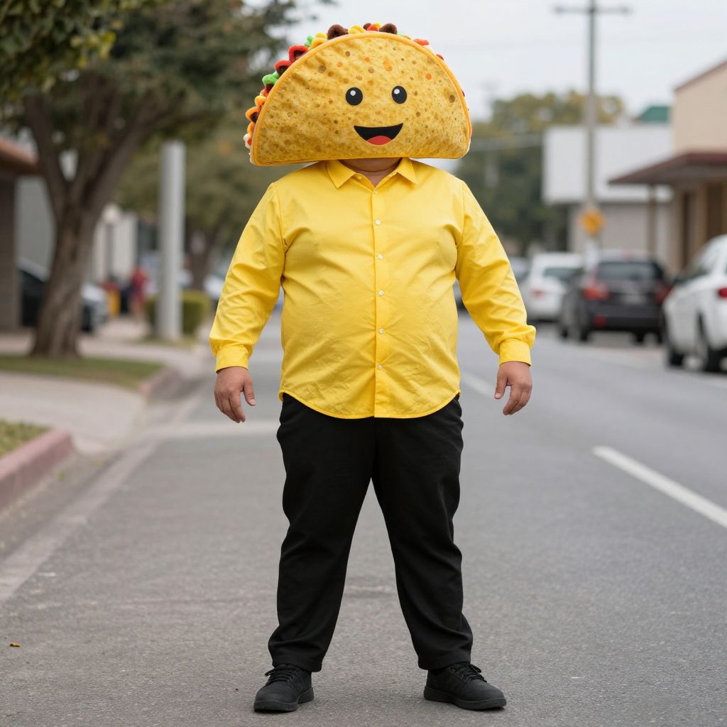 Realistic Adult Plus Taco Costume, dressed in a yellow shirt and black pants standing on a street