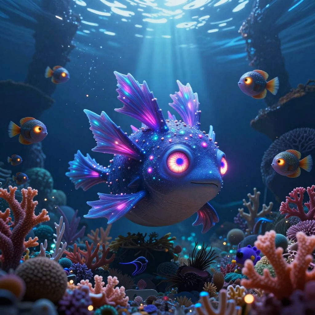 A surreal underwater scene featuring a large, glowing fantasy fish with neon-lit fins and vibrant eyes, surrounded by smaller similarly glowing fish and colorful coral reefs. The environment radiates a magical and mysterious ambiance with shimmering unnatural hues, inspired by fantasy and sci-fi art.
