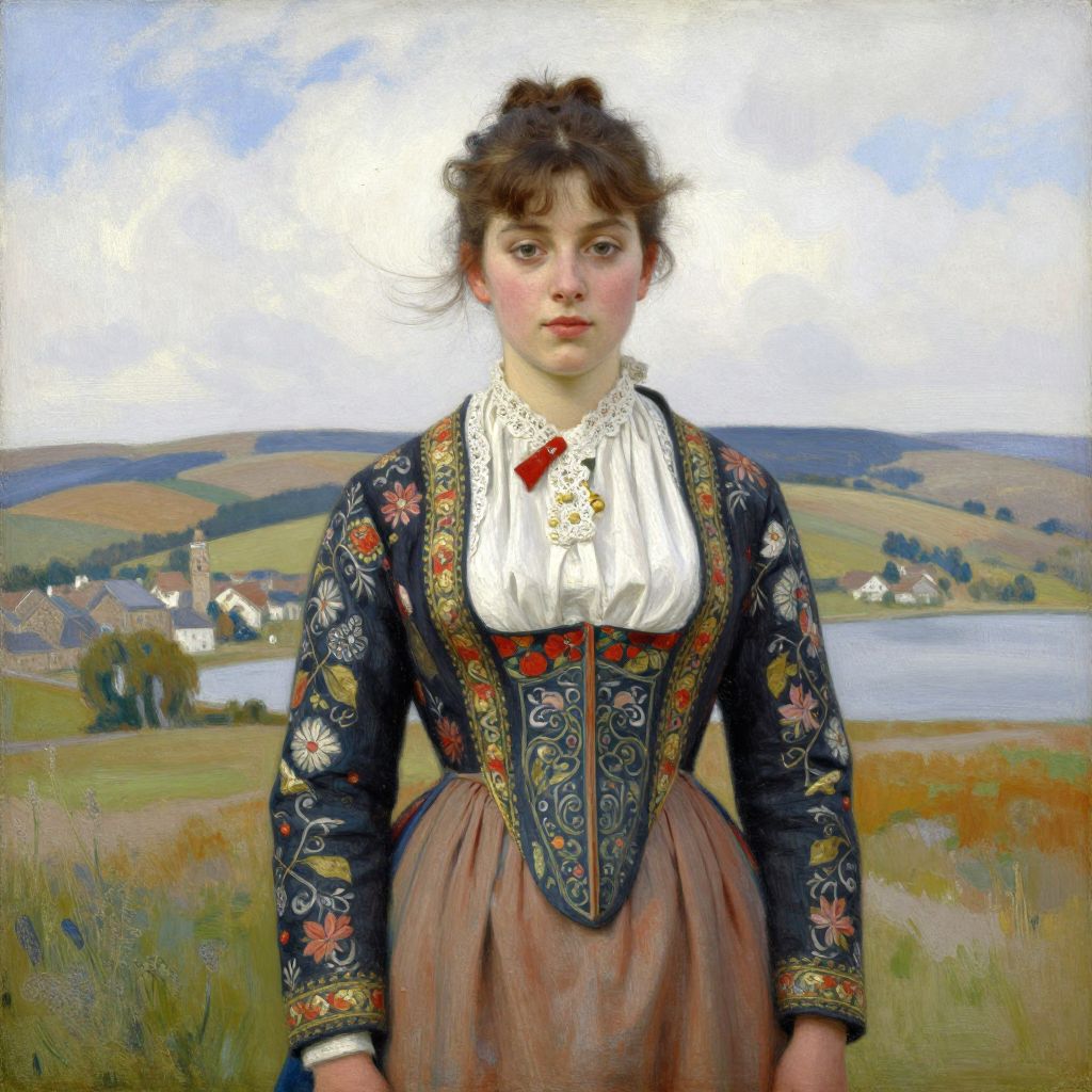 Realistic oil painting of a young woman in a traditional, floral-patterned black dress with white lace and red ribbon, standing in a picturesque, rural