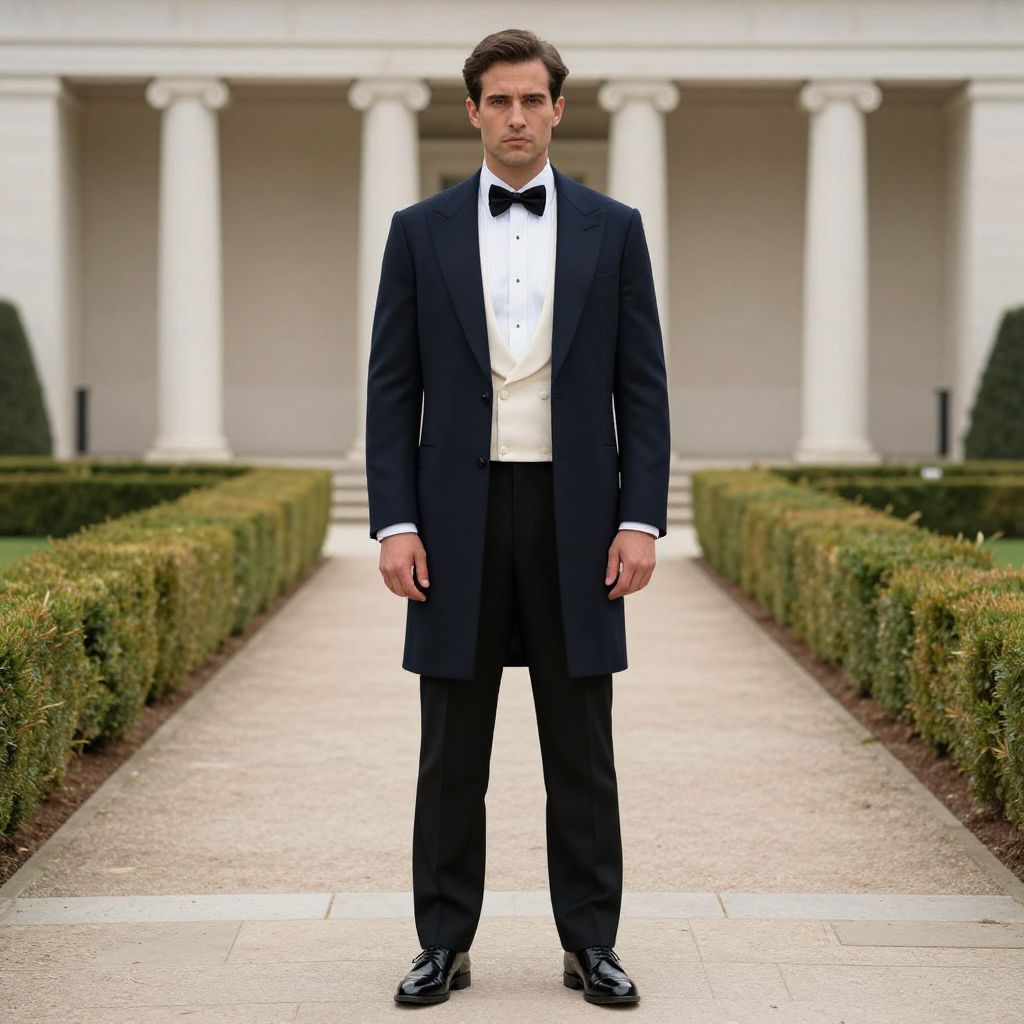 A man, navy morning coat, white dress shirt with pleats, cream waistcoat, black silk bow tie, straight-cut black trousers, sleek black derby shoes, neoclassical façade, grand columns, manicured gardens, cameraphone style, confident expression. Man has masculine face and piercing eyes