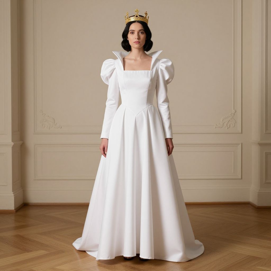 Photograph of a woman with fair skin and short black hair, standing in an elegant, cream-colored room with wooden parquet flooring. She wears a white, long-sleeved, floor-length gown with puffed shoulders and a square neckline. A gold crown with white gems rests on her head. The room features ornate, white, wainscoted walls with decorative molding. The woman's expression is neutral, and she stands centered, facing the camera directly. The lighting is soft, highlighting the smooth texture of her dress and the shiny crown.