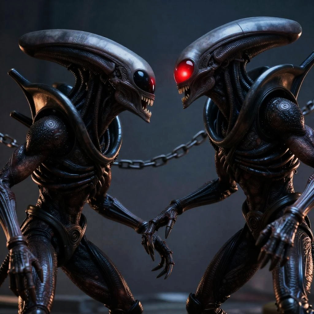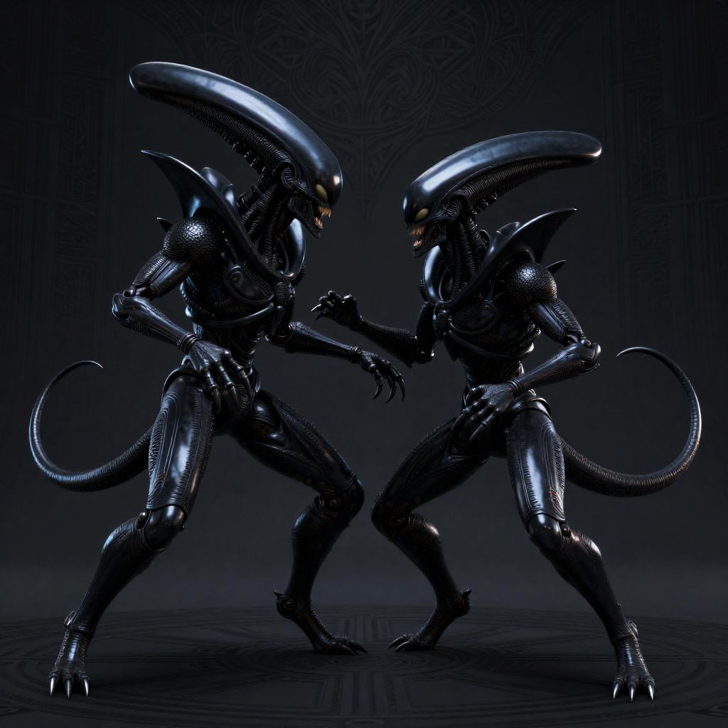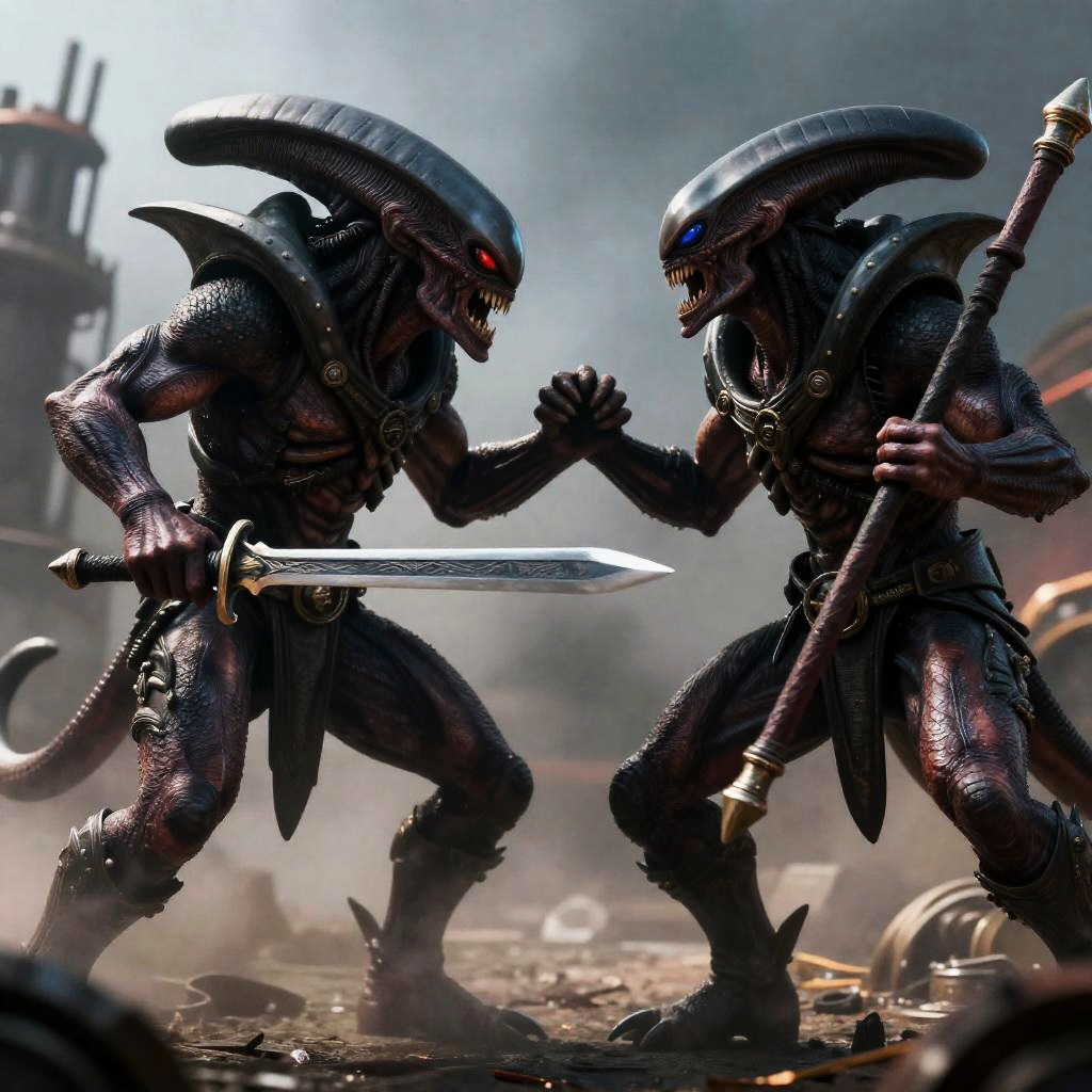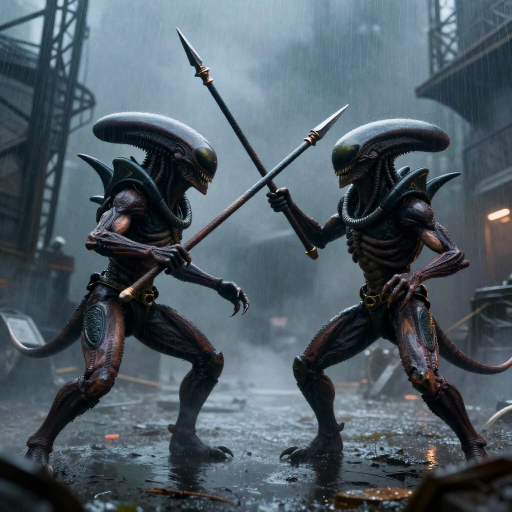 Two dark-skinned alien creatures with sleek, exoskeleton-like bodies and long, spiky appendages engage in an intense fight wielding sharp spears. The battle takes place in a rainy, industrial environment with metal structures and smoke in the background, enhancing the chaotic and dramatic atmosphere.