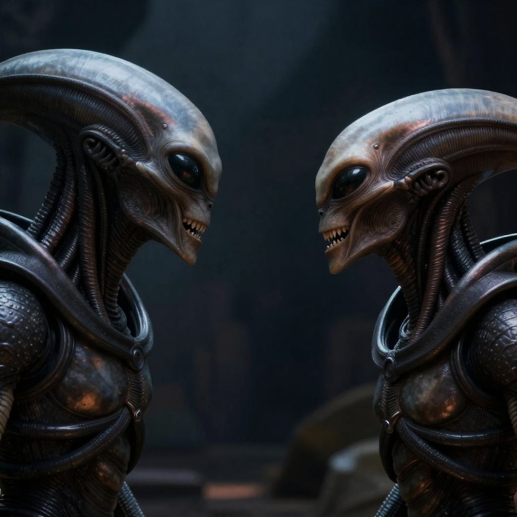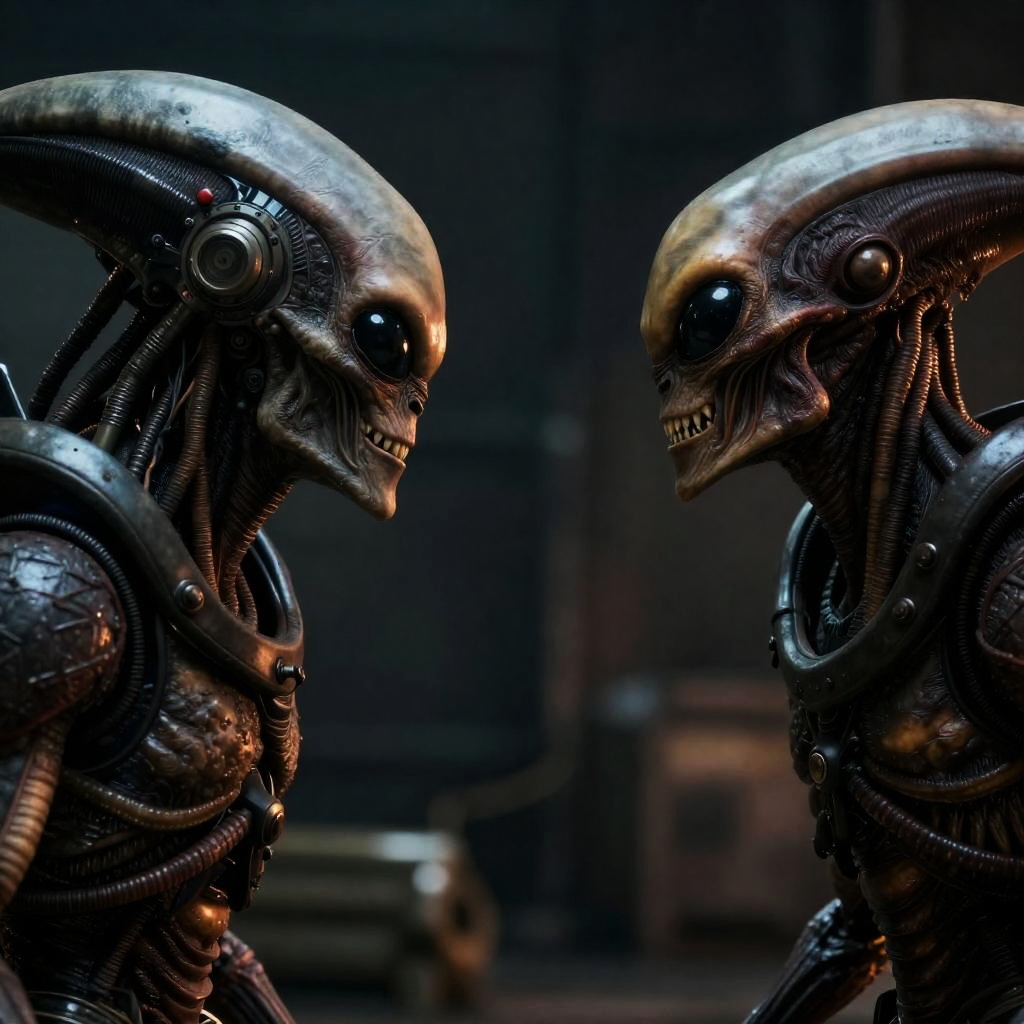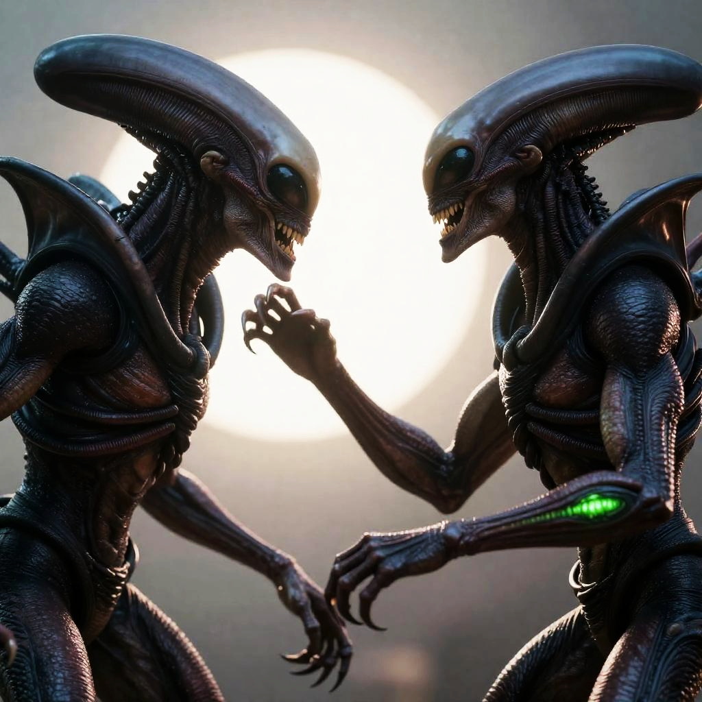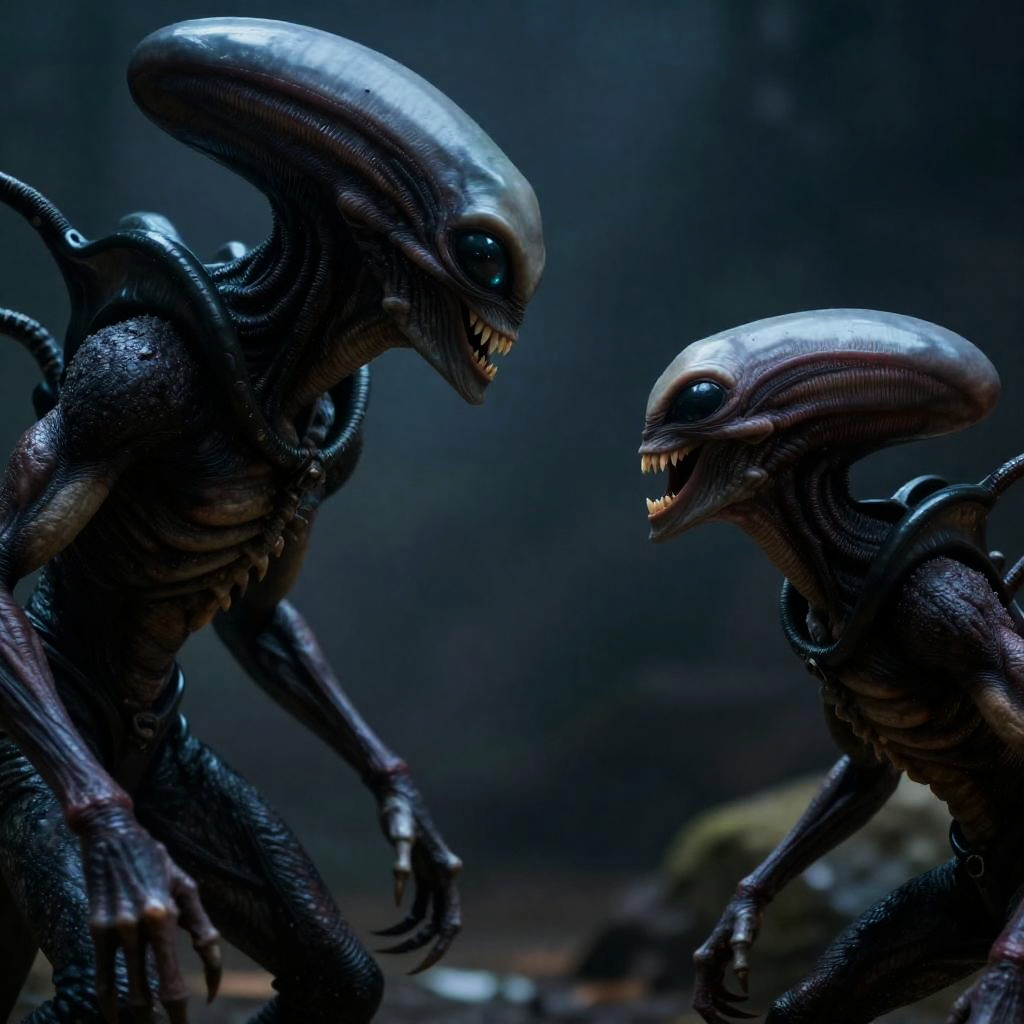 Two dark-skinned alien creatures with sleek, exoskeleton-like bodies and long, spiky appendages engage in an intense fight wielding sharp spears. The battle takes place in a rainy, industrial environment with metal structures and smoke in the background, enhancing the chaotic and dramatic atmosphere.