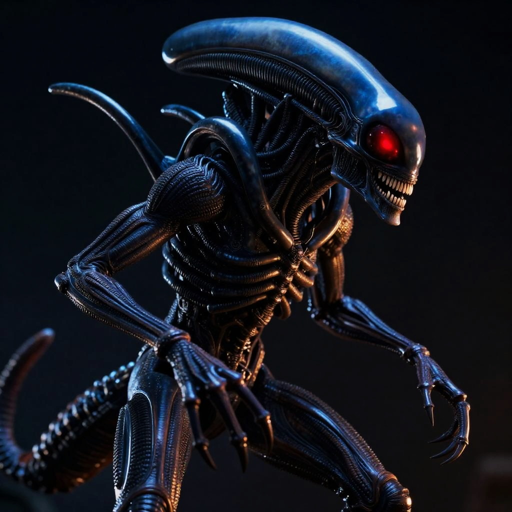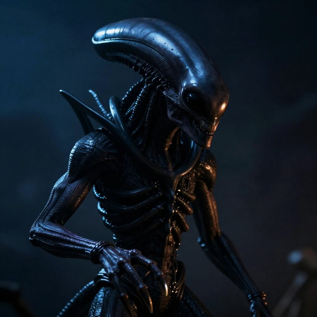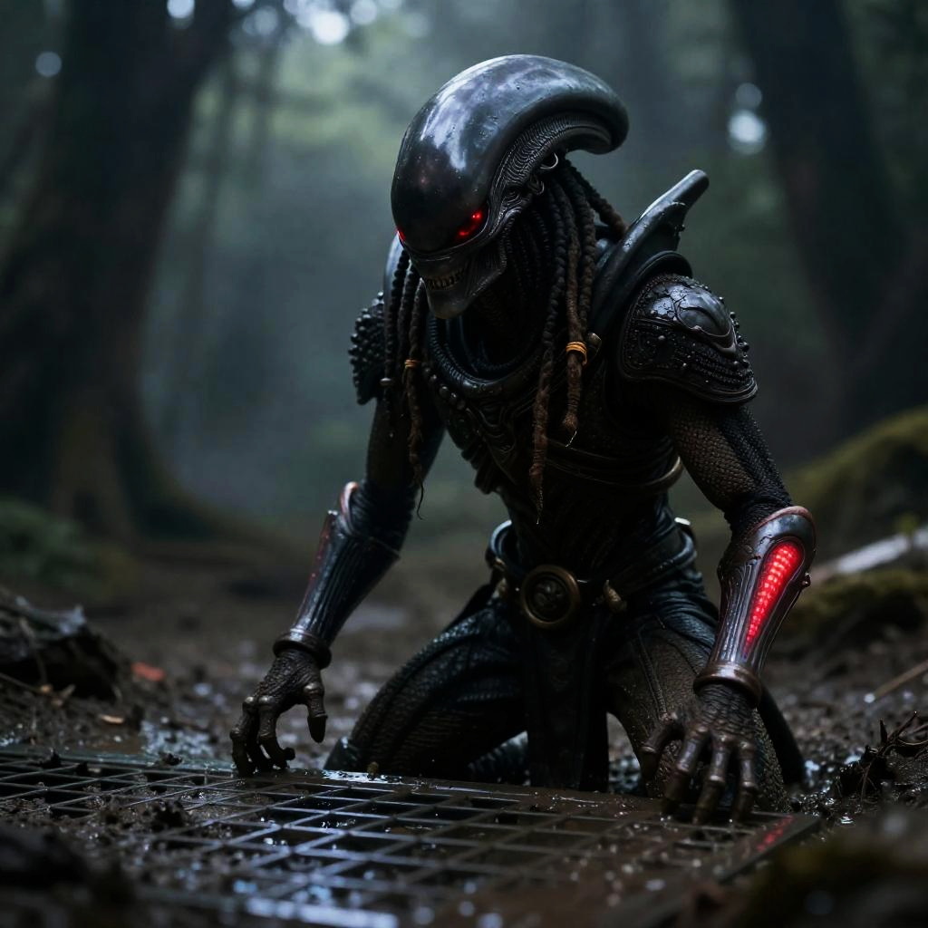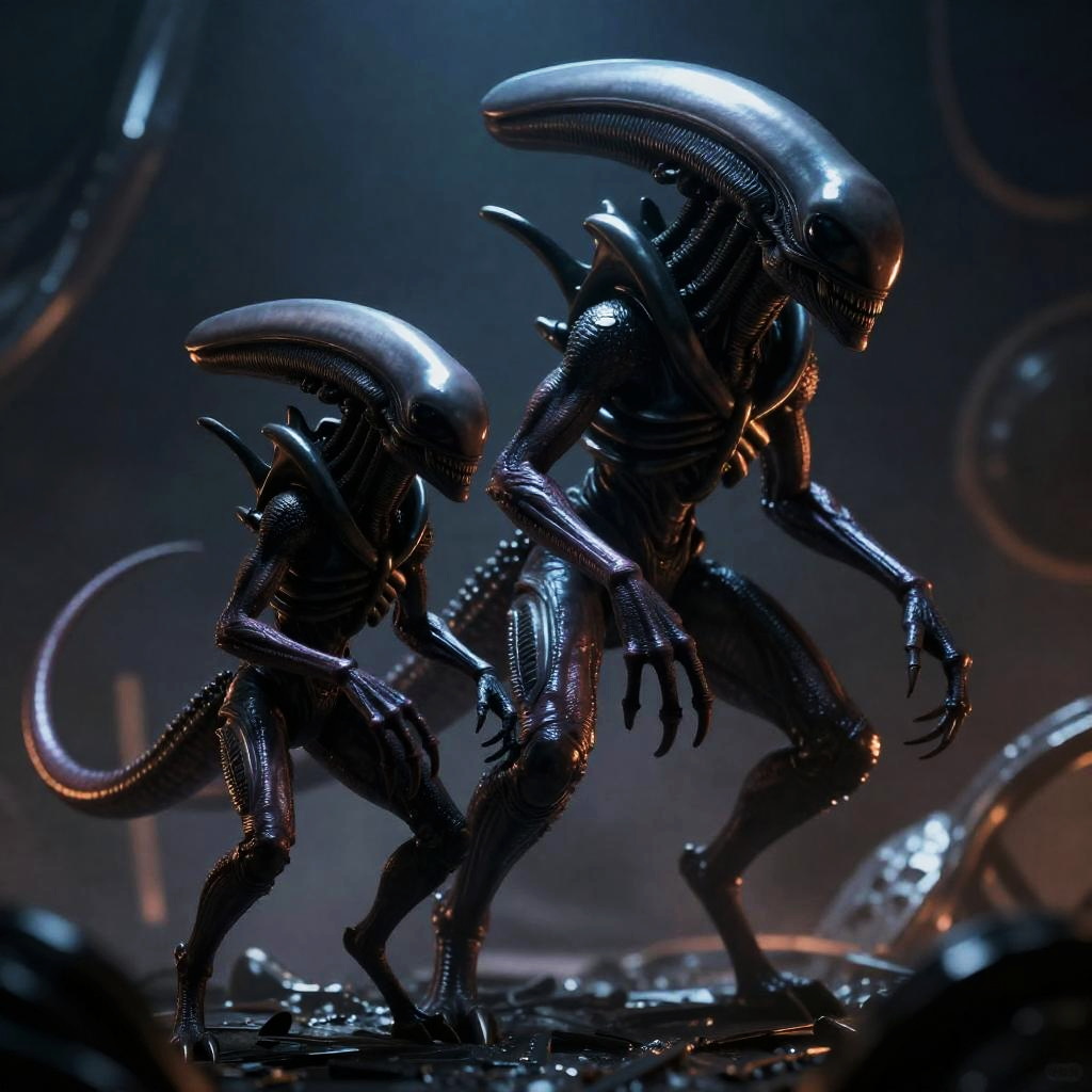 Two dark-skinned alien creatures with sleek, exoskeleton-like bodies and long, spiky appendages engage in an intense fight wielding sharp spears. The battle takes place in a rainy, industrial environment with metal structures and smoke in the background, enhancing the chaotic and dramatic atmosphere.
