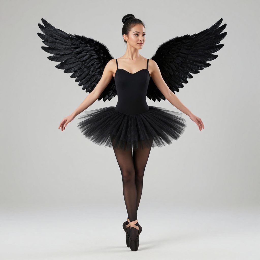 Photograph of a ballerina with black wings, black tutu, black tights, and black ballet shoes, standing gracefully on pointe.