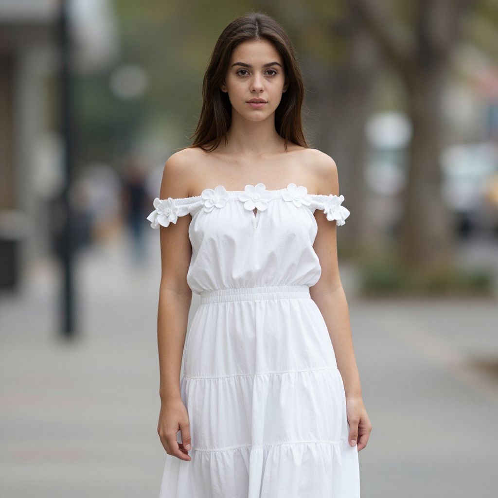 "white tiered maxi dress, 1girl, solo, dress, brown hair, long hair, white dress, flower, off shoulder, looking at viewer, off-shoulder dress, brown eyes, blurry, blurry background, bare shoulders, standing, outdoors Realistic photo of casual sexy person with pretty face"