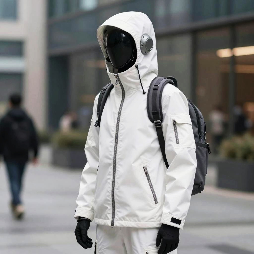 (realistic:1.2), blurry, blurry_background, blurry_foreground, depth_of_field, jacket, solo, long_sleeves, weapon, hood, bag, scarf, from_side, white_jacket, backpack, helmet, robot, 1other, zipper, science_fiction, urban techwear