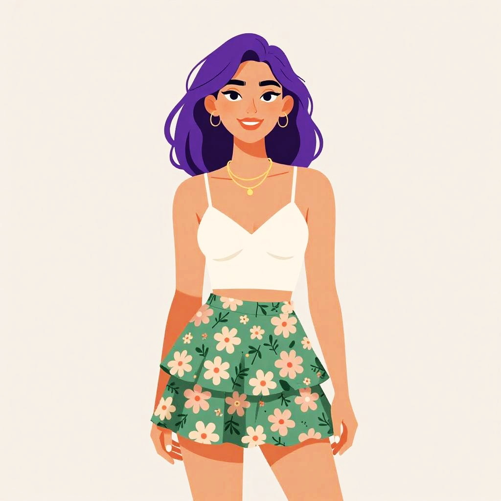 Digital illustration of a smiling woman with purple hair, wearing a white floral dress with orange and yellow flowers, and a purple skirt, standing against a white