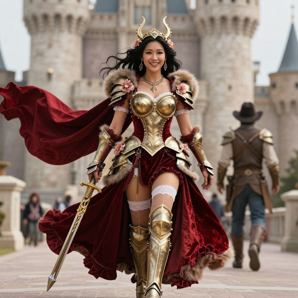 (goddess-like happiness, flirtatious, seductive:1.4), (RAW photo:1.2), (photorealistic:1.6), (ultimate quality, masterpiece:1.3), (intricate details:1.2), (detailed face:1.2), dramatic, ray tracing, (lens 135mm, f1.8:1.2), (model style, photograph), fFaceDetail, fHandDetail, dutch angle, cowboy shot, castle, (Asian-Less:1.6), ohwx, ohwx woman, War_Glam, wearing War_Glam, (flowery, flower knight girl, solo, walking towards viewer, holding weapon:1.6), floating hair, golden hair ornament, floating red cape, hook, viel, golden armor, fur trim, red armored dress, long velvet dress, medium breasts, narrow waist, magnificent, gorgeous, stockings, lace-trimmed legwear, gorgeous armor, breastplate, gauntlets, guardebras, leg armor, spurs, arms behind back, motion blur