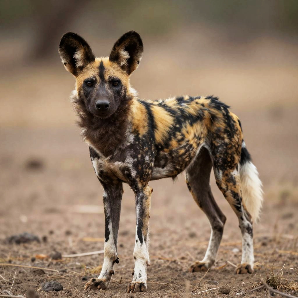 Photograph of an African wild dog standing on a dry, dirt-covered ground. The dog has a distinctive coat of black, yellow, and white patches, with large, pointed ears and a focused expression. Its fur is short and dense, with a mix of textures. The background is blurred, featuring earthy tones and sparse vegetation. The dog's legs are white at the lower sections, contrasting with the darker upper body. The lighting is natural, highlighting the dog's vivid coat patterns and alert posture. The dog appears to be in a savanna or dry grassland environment.