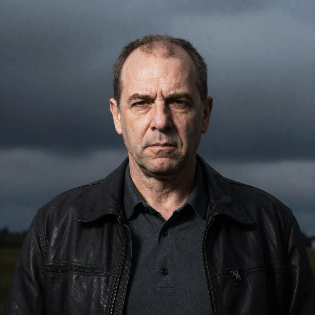 Middle-aged man with weathered eye leaning on wall