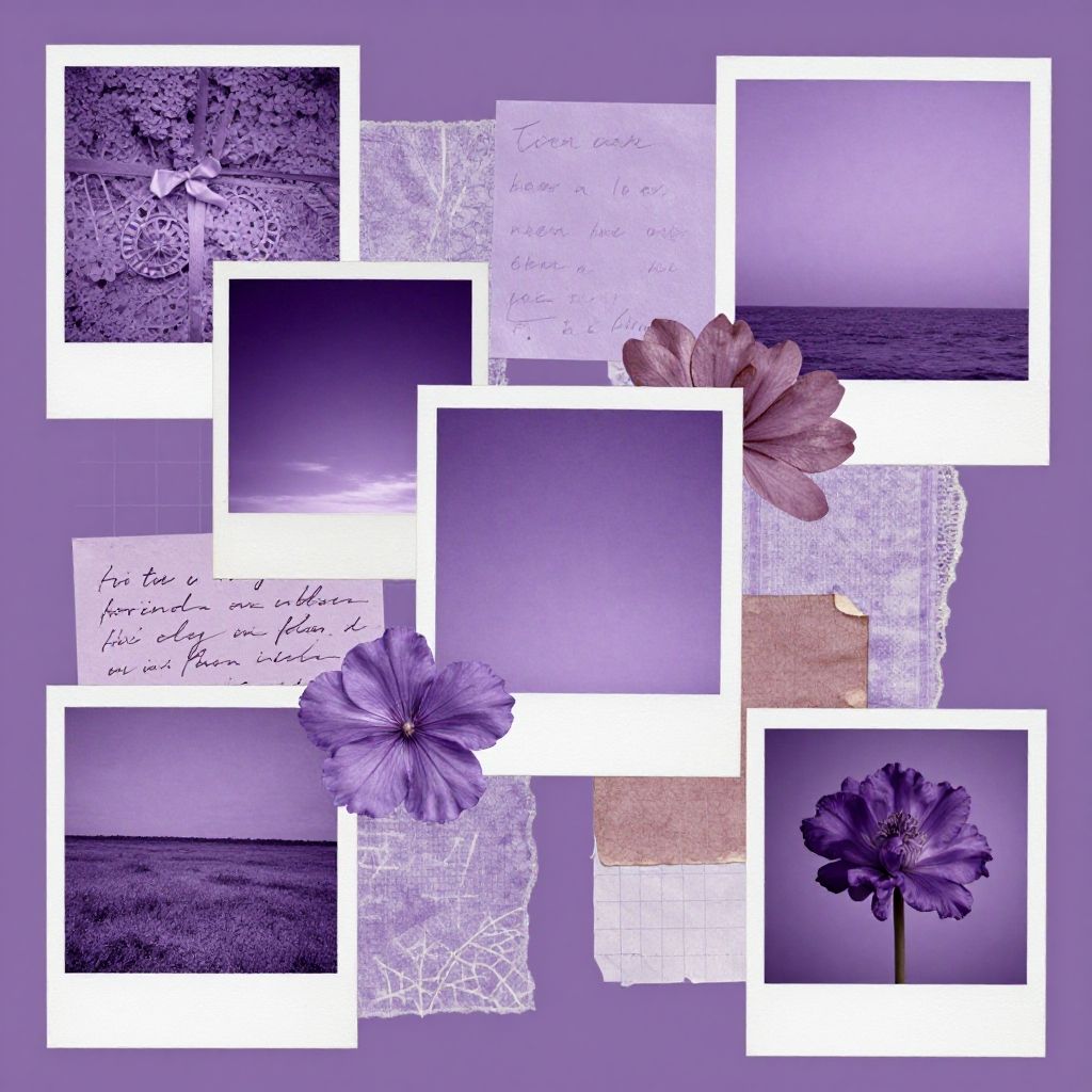 Aesthetic purple collage composed of vintage photos, textured fabrics, and handwritten notes, blending shades of lilac, mauve, and plum, surreal and nostalgic atmosphere with soft gradients and mixed media details, artistic and elegant composition