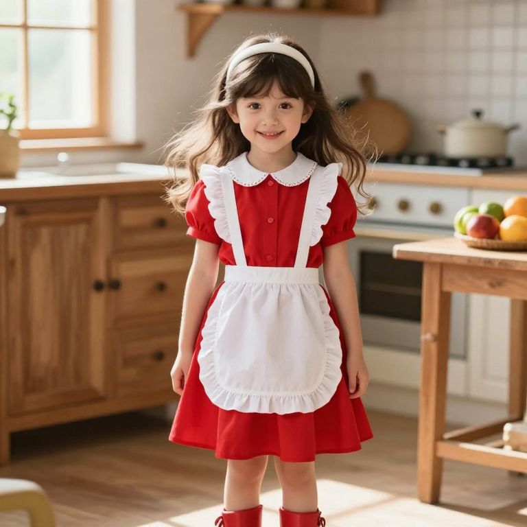 A young girl with bright, curious eyes and soft, natural curls stands on a sunny sidewalk, wearing a white cap, a white button-up shirt, and a brown outfit with a cheerful polka dot pattern. She has a vibrant pink bow tied neatly on her head, and she is looking slightly forward with a warm, joyful expression. The scene is set in a quiet, picturesque neighborhood during early spring, with soft sunlight filtering through trees and a gentle breeze rustling the leaves in the background.