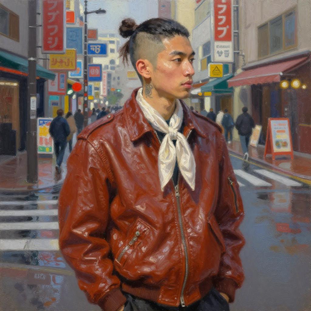 An artistic portrayal of a young Japanese man in his late 20s with shaved sides and a topknot, warm sunlit skin, a faint single rose tattoo behind his ear, calm introspective expression dressed in a vintage rust-colored leather bomber jacket with a white silk scarf loosely draped around his neck, standing on a bustling urban street corner lined with neon signs and rain-slick pavement, rendered in a vibrant impressionist oil painting style with thick textured brushstrokes and dynamic lighting.