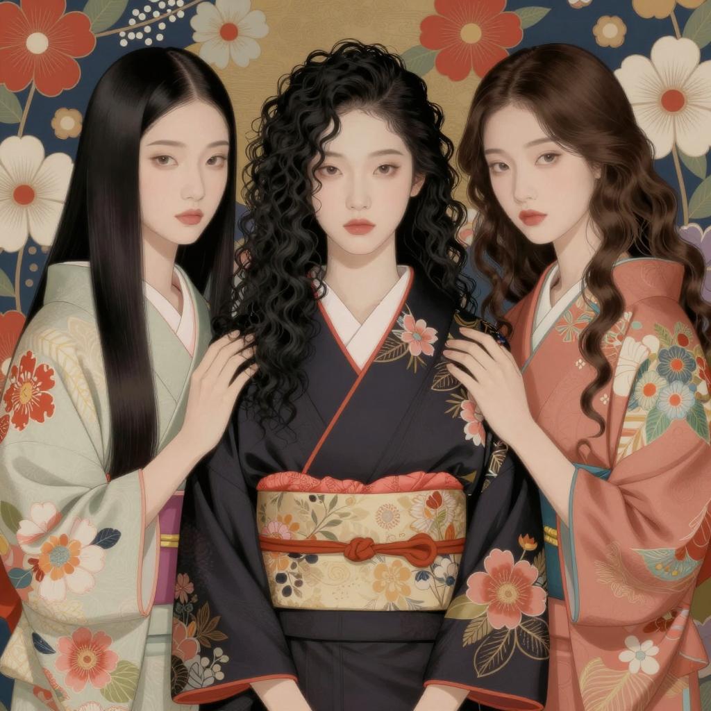 Elegant Trio in Colorful Kimonos