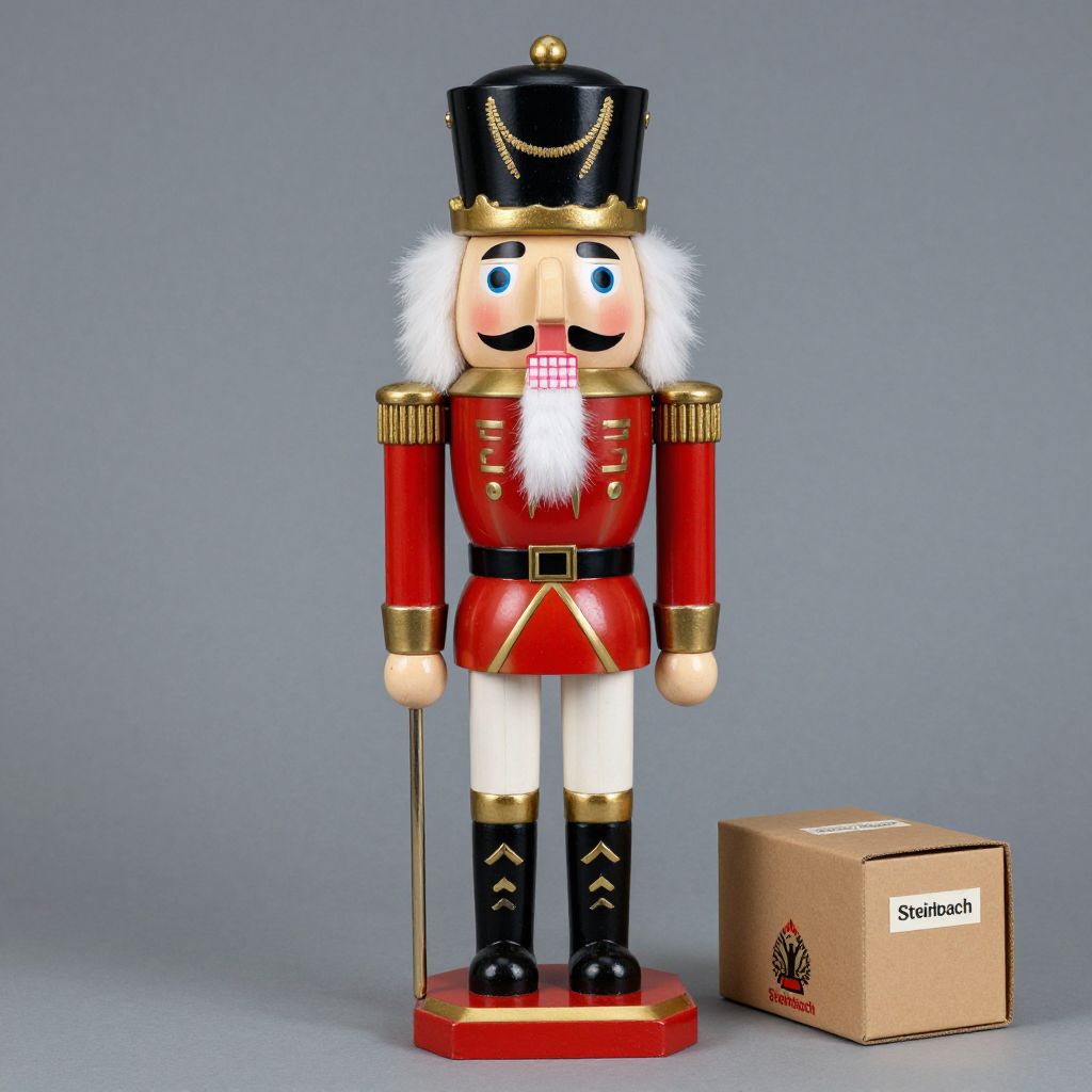 Photograph of a classic Nutcracker soldier with red uniform, white pants, black boots, and gold accents, standing beside a "Schleich"