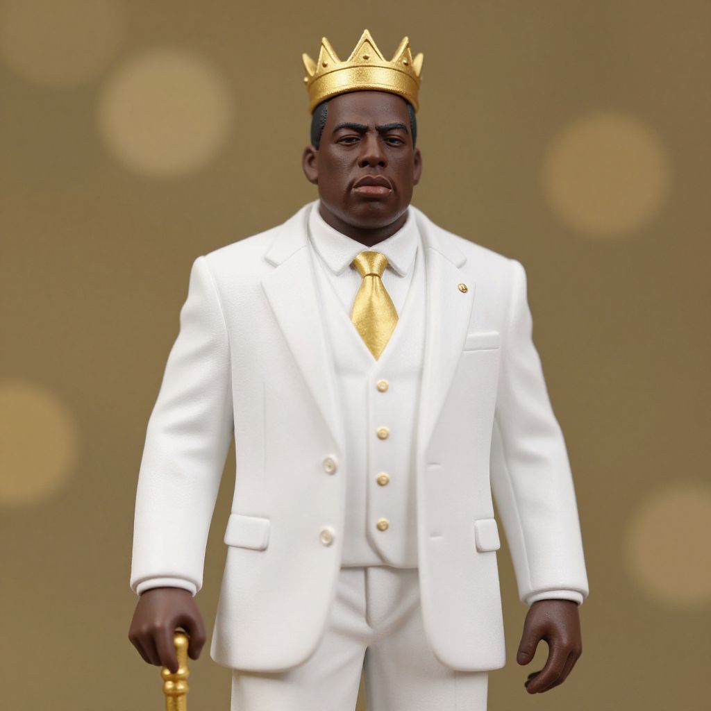 Notorious big, one anime nendoroid of notorious big in a elegant white suit, wearing a gold crown, with a walking stick, figurine, detailed product photo, bokeh