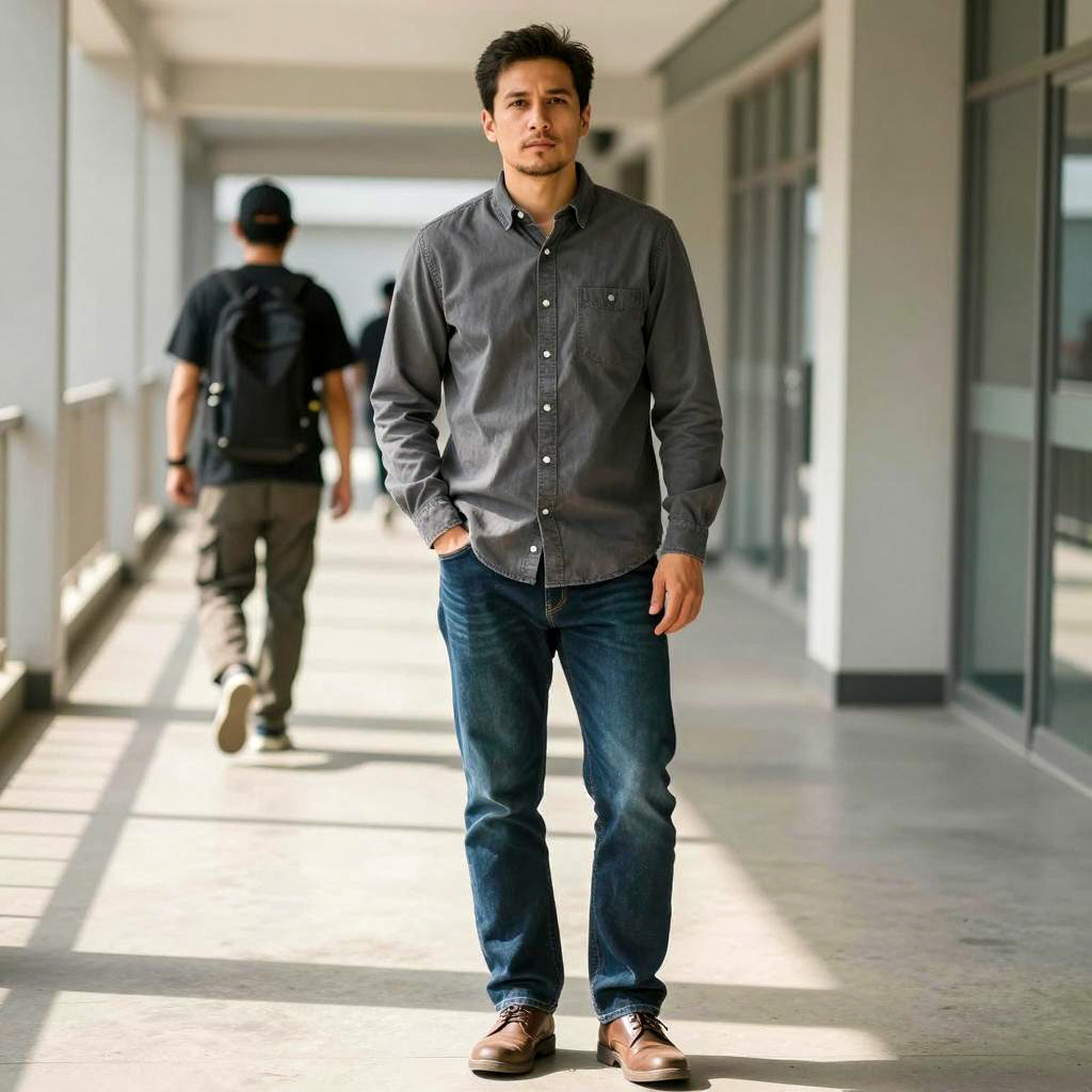 Dark gray jeans costume, photorealistic, standing man, casual attire, long-sleeve grey button-up shirt, dark blue jeans, brown shoes, short dark hair, light stubble, serious expression, daylight, indoor corridor, blurry background, person walking in background, wearing black cap and backpack, shadows on floor, natural light, contemporary style