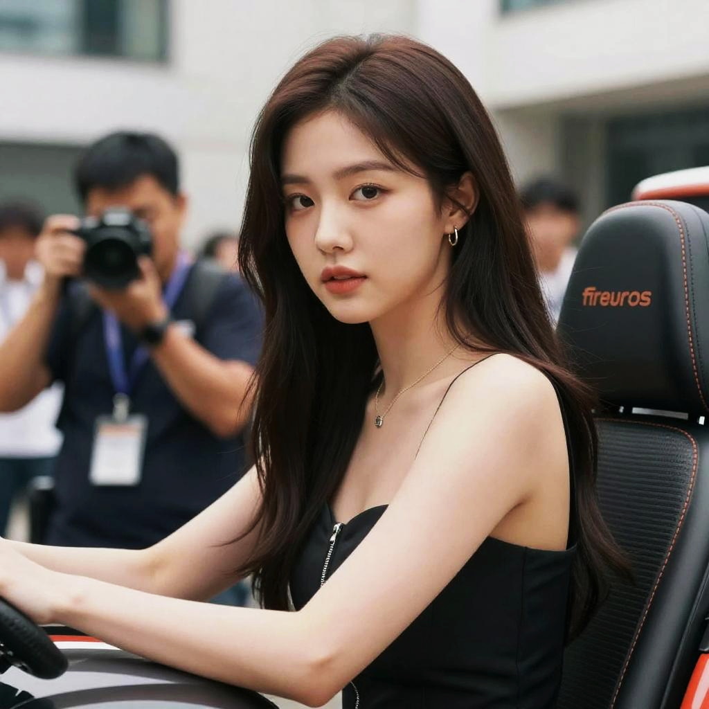 (realistic, photorealistic:1.4), (ulzzang-6500-v1.1:0.8), pureerosface_v1, public, race queen, motor vehicle, photographer, masterpiece, best quality, highly detailed