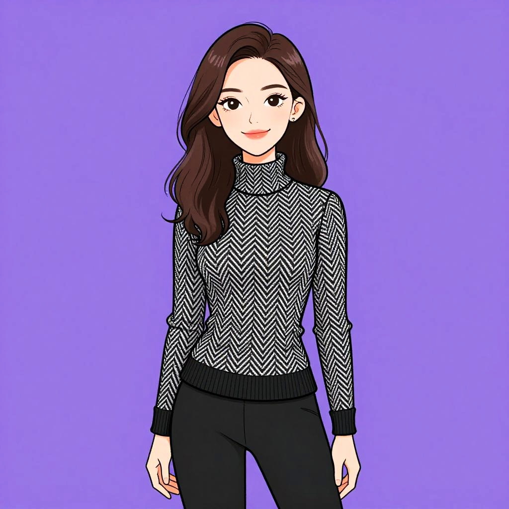 Illustration of a young woman with long brown hair and a pretty face, smiling softly. She is wearing a casual black and white herringbone-patterned knit sweater with a turtleneck, long sleeves with black cuffs, and a fitted waistband, paired with black leggings. The background is a solid purple color.