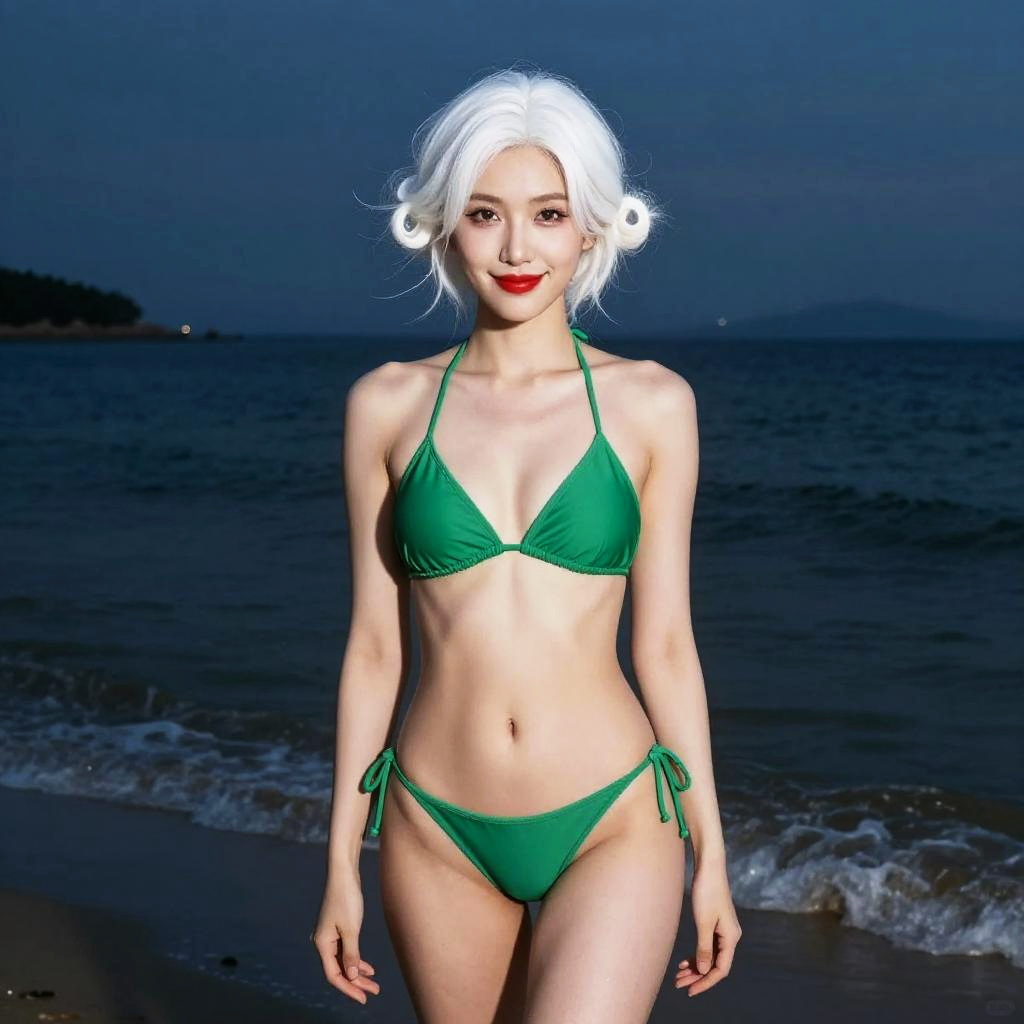 1girl, solo, full body shot, masterpiece, best quality, (photorealistic:1.4), a photo of a beautiful woman, landscape with Three-Point Perspective, white hair, perm hairstyle, (night:1.1), smiling, red lips, perfect face, detailed face, green micro bikini
