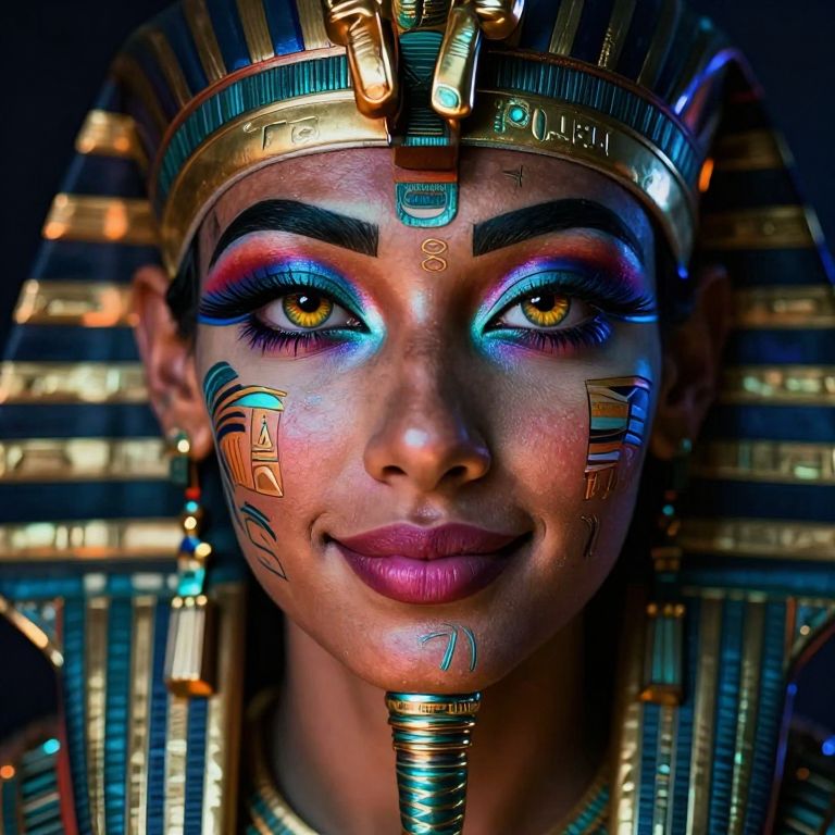 Photograph of a woman with glowing blue and purple eye makeup, wearing an Egyptian-style headpiece with gold accents and hieroglyphics.