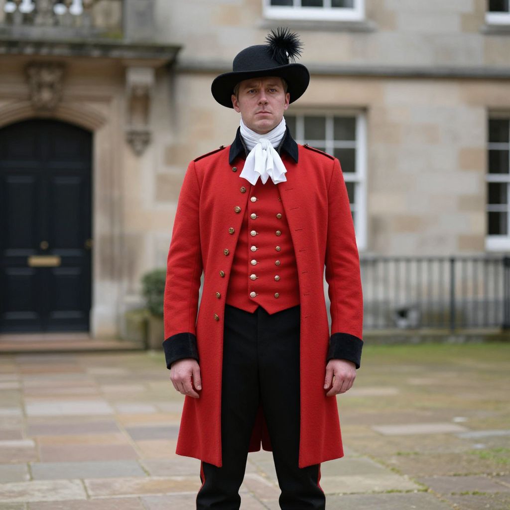 Famous British Costume, man in a red coat and hat standing in a courtyard