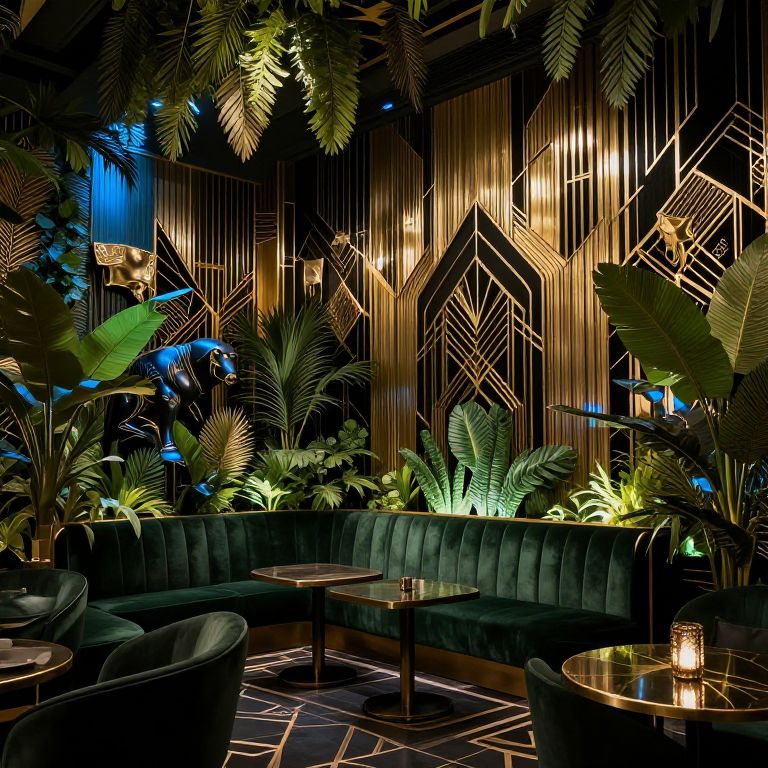 Art deco jungle interior design concept, combining lush artificial foliage with metallic gold and black geometric wall art, stylized animal sculptures, and ambient blue lighting, capturing the exotic luxury and glamour of an urban jungle lounge inspired by early 20th century aesthetics.