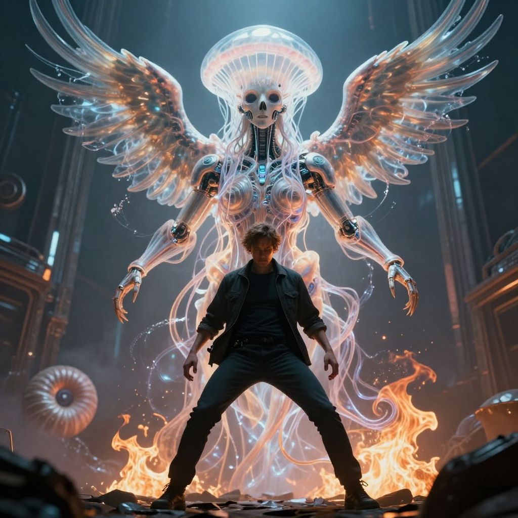 Digital artwork of a man standing before a glowing, ethereal, winged skeleton with fiery backdrop in a dark, futuristic cathedral.