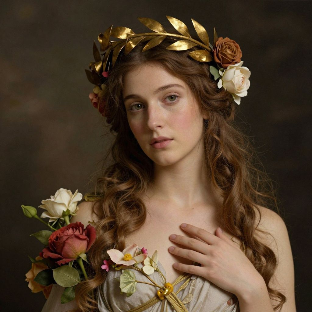 This is a digital photograph of a young woman with fair skin and long, wavy brown hair. She wears a golden laurel crown adorned with brown and white roses and green leaves. Her attire is a white, strapless, classical-style dress decorated with floral garlands, including pink and white roses with green leaves. Her right hand is gently placed on her chest. The background is dark and blurred, focusing attention on her. Her expression is serene and slightly melancholic, with soft pink blush on her cheeks. The overall style is reminiscent of classical Greek or Roman art.