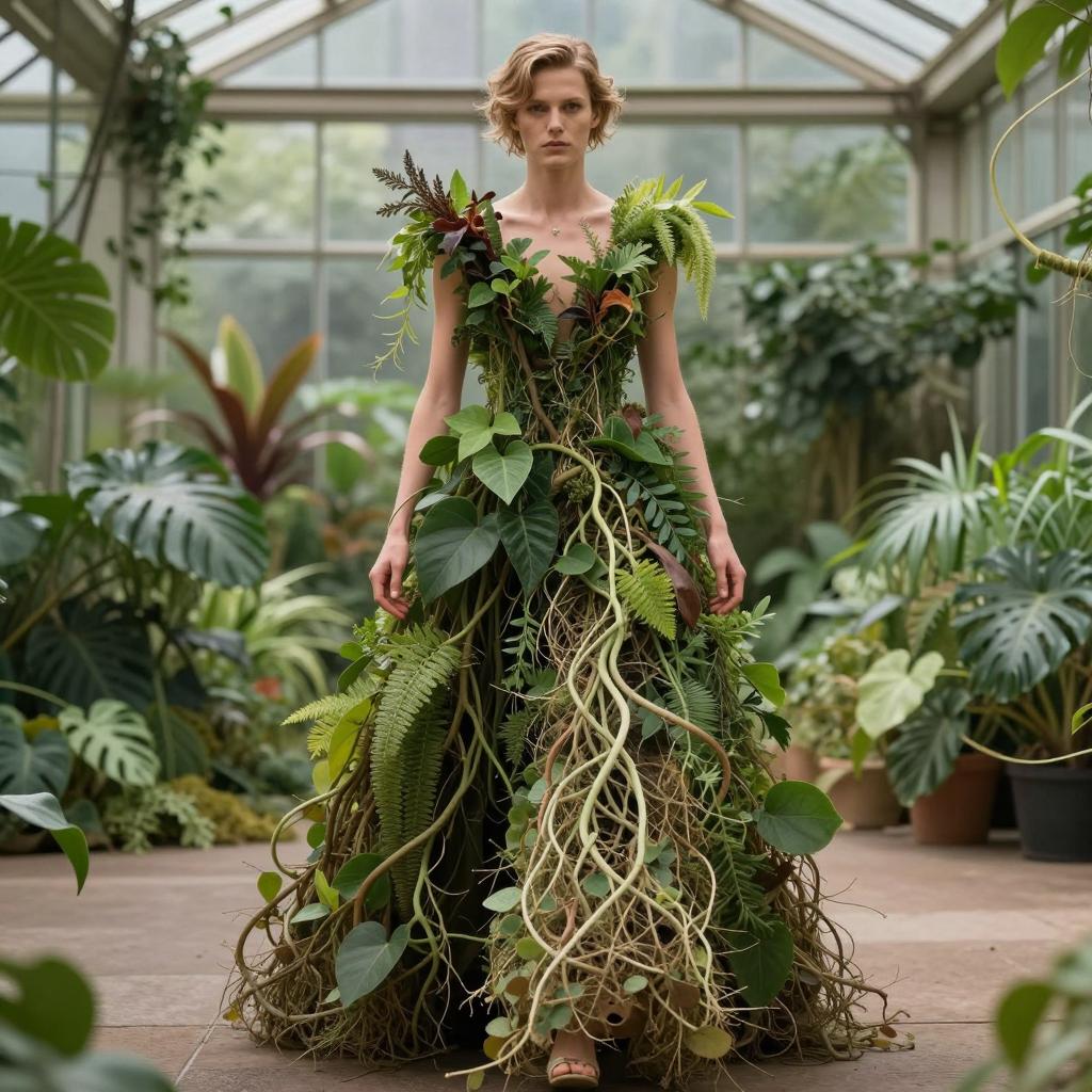 Terry Richardson Conceptual fashion piece featuring a dress made entirely out of live plants, with an intricate network of roots and vines woven together to create a stunning, living garment, showcased in a lush, verdant greenhouse setting with natural light and botanical backdrops,