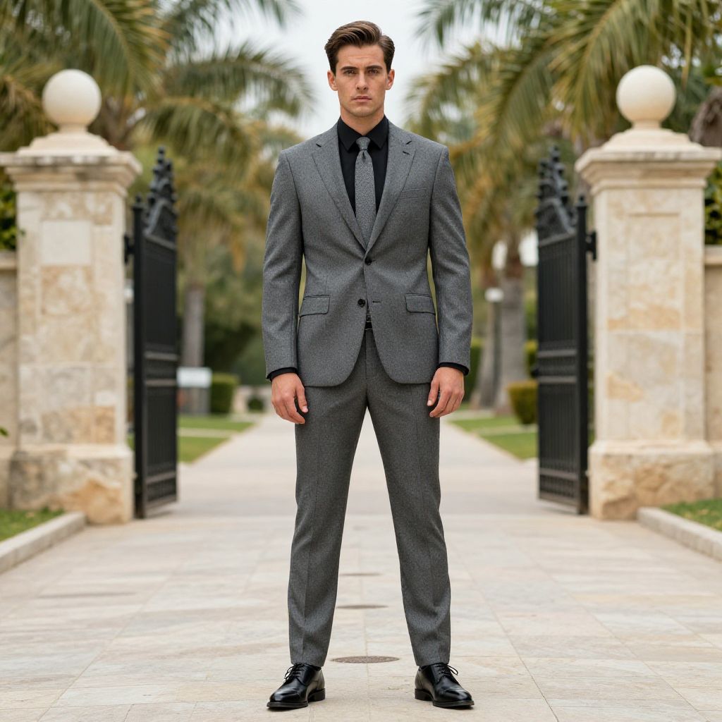 Photograph of a handsome man in a black suit, white shirt, and black tie, standing on a beachside path with palm trees in the background