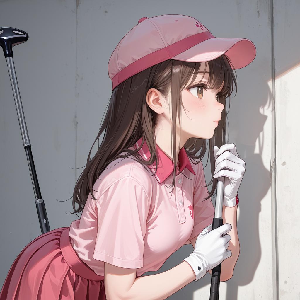 (Best quality, 8k, 32k, Masterpiece, UHD:1.2), Photo of Pretty Japanese woman, 1girl, White and pink polo shirt, Pink skirt, (medium short [dark brown} hair), double eyelid, Pink cap, golf club, white glove, side shot, stare into the distance